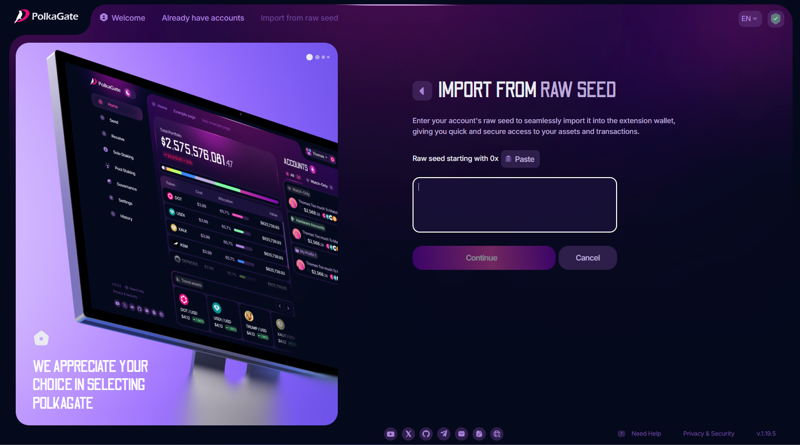 <figure><img src="https://129318620-files.gitbook.io/~/files/v0/b/gitbook-x-prod.appspot.com/o/spaces%2FDDJNhJVFiHXUkYj2IXXu%2Fuploads%2Fo2jH2t5p16KzSaZy5abT%2Fimage.png?alt=media&#x26;token=a105312e-d43c-4a3d-9627-1347a4472f78" alt=""><figcaption><p>Import from Raw Seed (full-screen)</p></figcaption></figure>