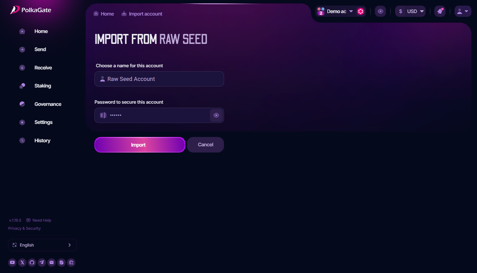 <figure><img src="https://129318620-files.gitbook.io/~/files/v0/b/gitbook-x-prod.appspot.com/o/spaces%2FDDJNhJVFiHXUkYj2IXXu%2Fuploads%2FaX2yRreEeiUaJMBa8jJp%2Fimage.png?alt=media&#x26;token=dd5519fd-a002-4346-9cf7-90a2cb214ff4" alt=""><figcaption><p>Import from Raw Seed (full-screen)</p></figcaption></figure>