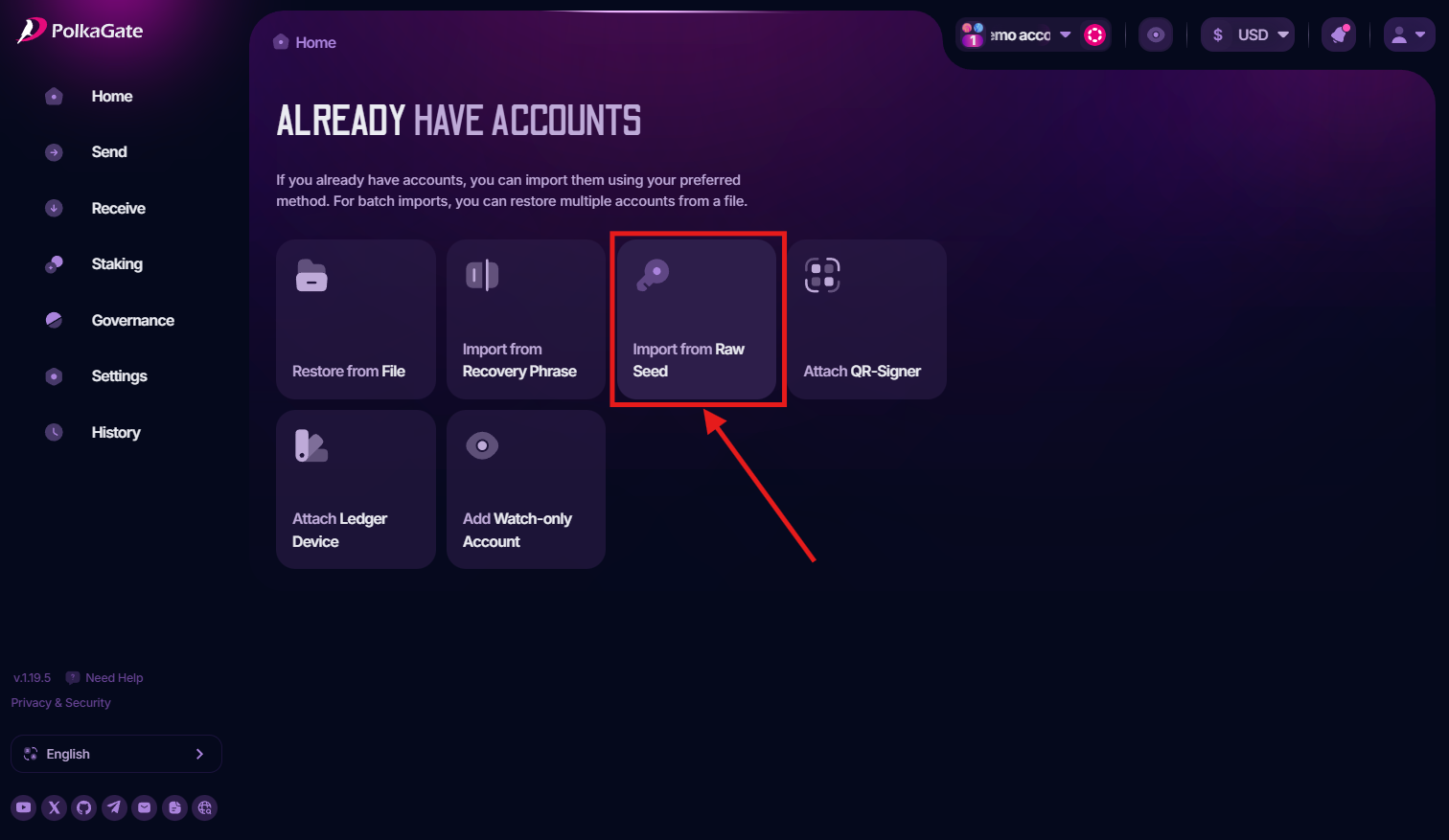 To import an account from **Raw Seed** (a 66-character string that starts with `0x`) into the PolkaGate, you’ll first see this option on the onboarding page after installing the extension. Simply click **Already have accounts**, then select **Import from Raw Seed**, as shown below.