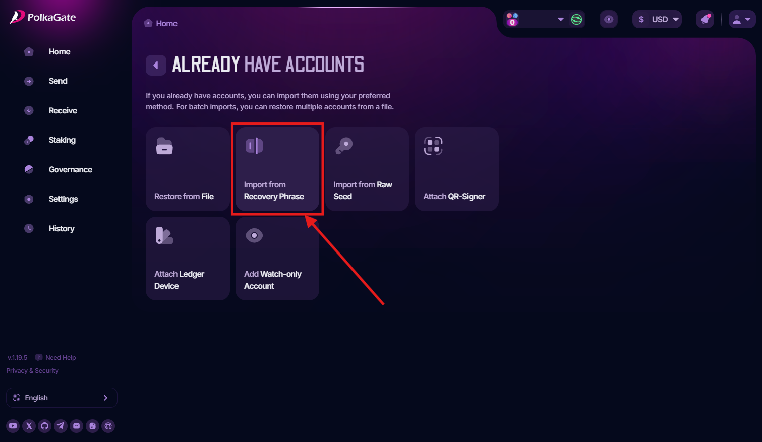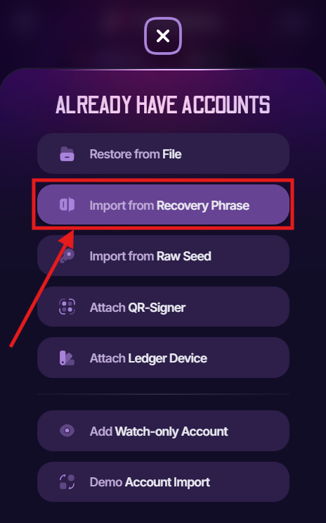To import an account using its **recovery phrase** into the PolkaGate, you’ll first see this option on the onboarding page after installing the extension. Simply click **Already have accounts**, then select **Import from Recovery Phrase**, as shown below.