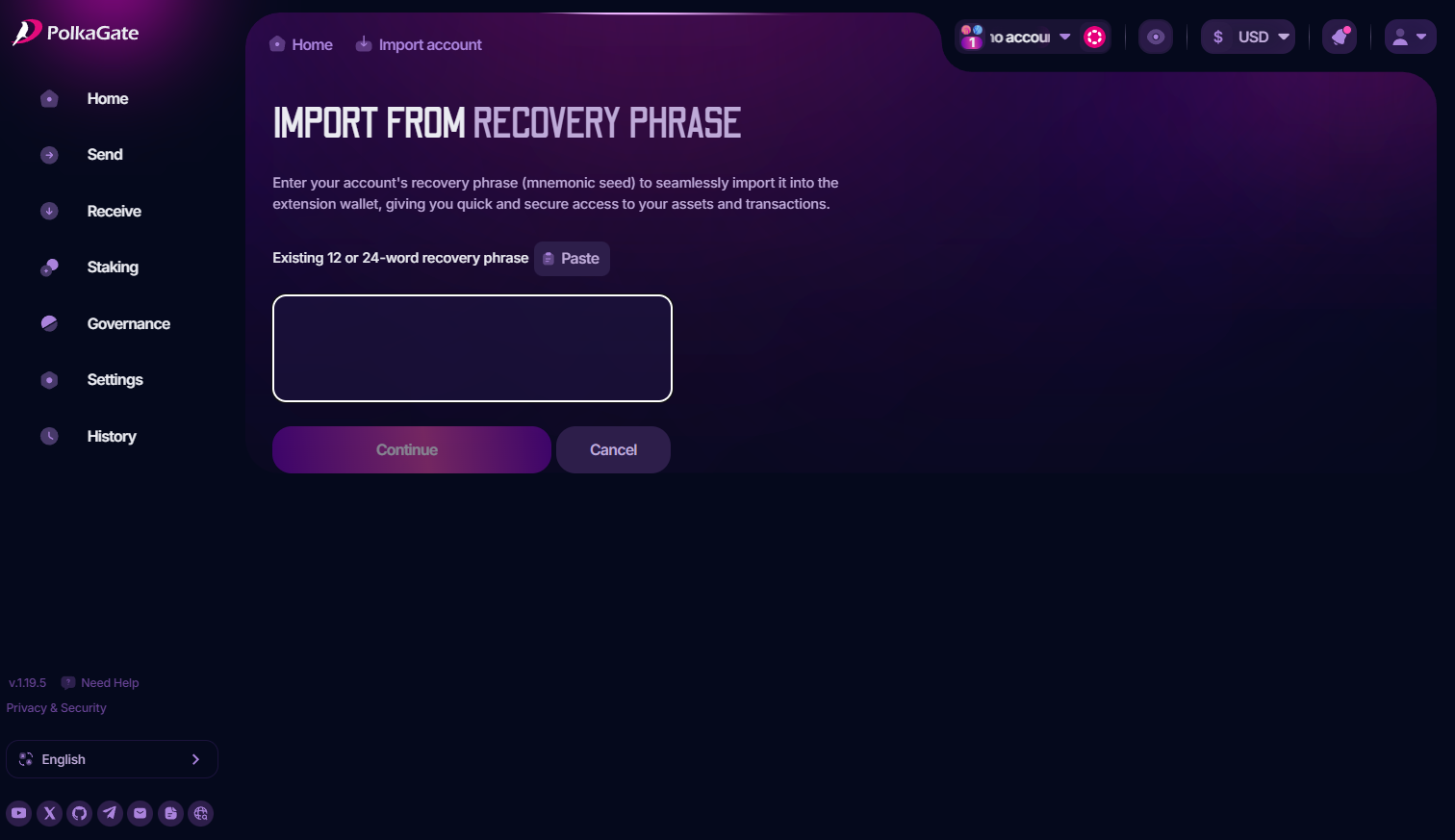 When you click **Import from Recovery Phrase**, you’ll be taken to a page where you can enter (or paste) your recovery phrase into the text box.