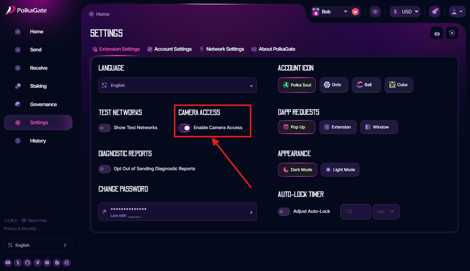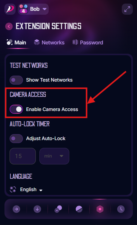 To enable it in **extension mode**, open **Settings → Extension Settings → Main tab**, and toggle **Enable Camera Access**, as shown below.