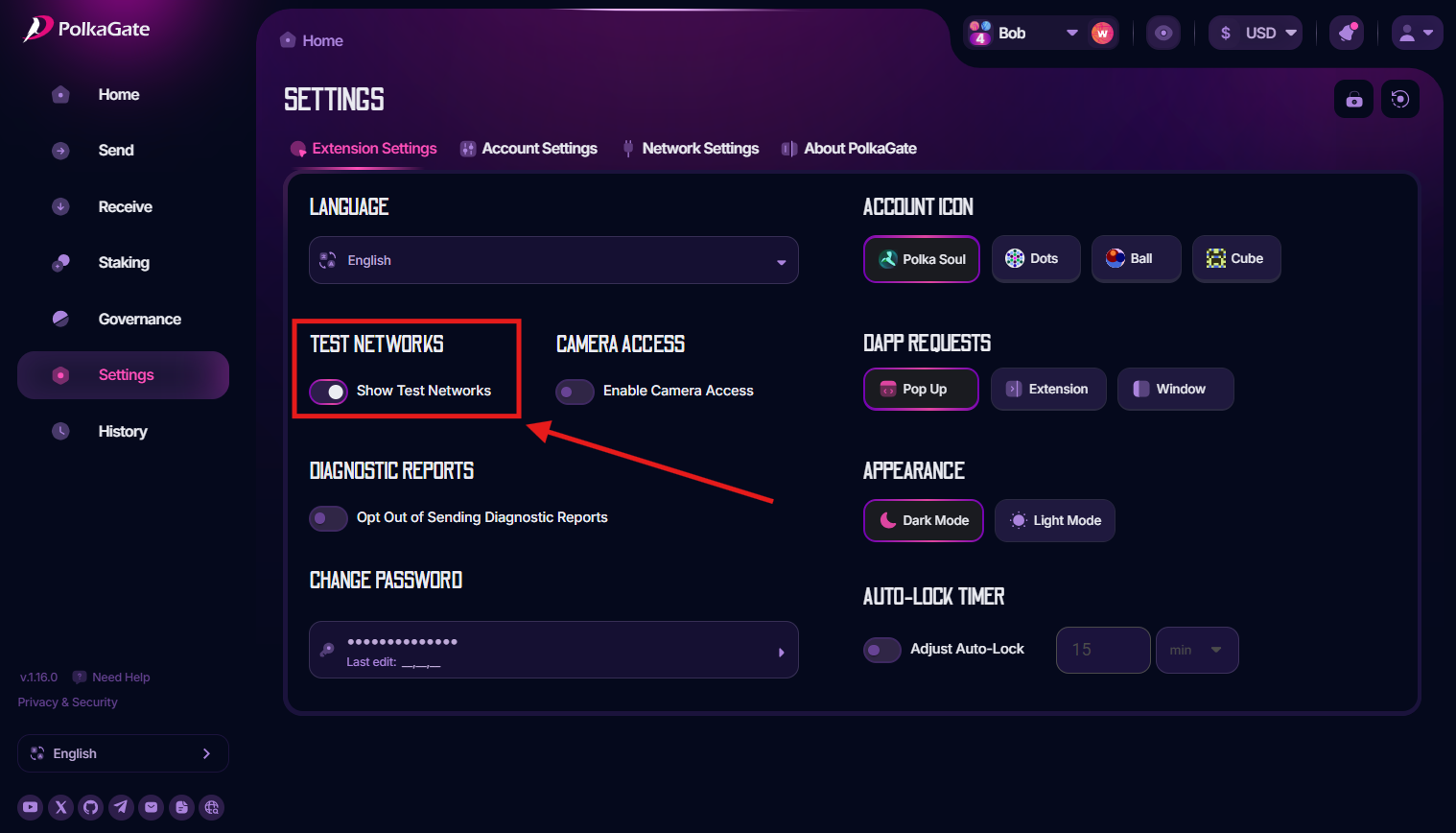 To enable them in the extension mode, open **Settings → Extension Settings →** on the **Main** tab toggle **Show Test Networks**, as shown below.